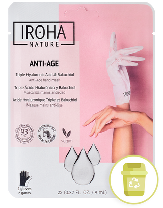 Los Guantes Mascarilla Antiedad con Triple Ácido Hialurónico ofrecen un cuidado global antiedad de las manos gracias a su concentrada e innovadora fórmula que previene, reduce y repara los signos de envejecimiento de las manos. Otro ingrediente es el Bakuchiol, una alternativa vegana al Retinol, que reduce líneas de expresión y arrugas. También cuenta con Niacinamida, que atenúa las manchas y aporta luminosidad, unificando el tono de la piel. Gracias a la tecnología de doble capa que presentan, los guantes crean un efecto sauna para potenciar los resultados.