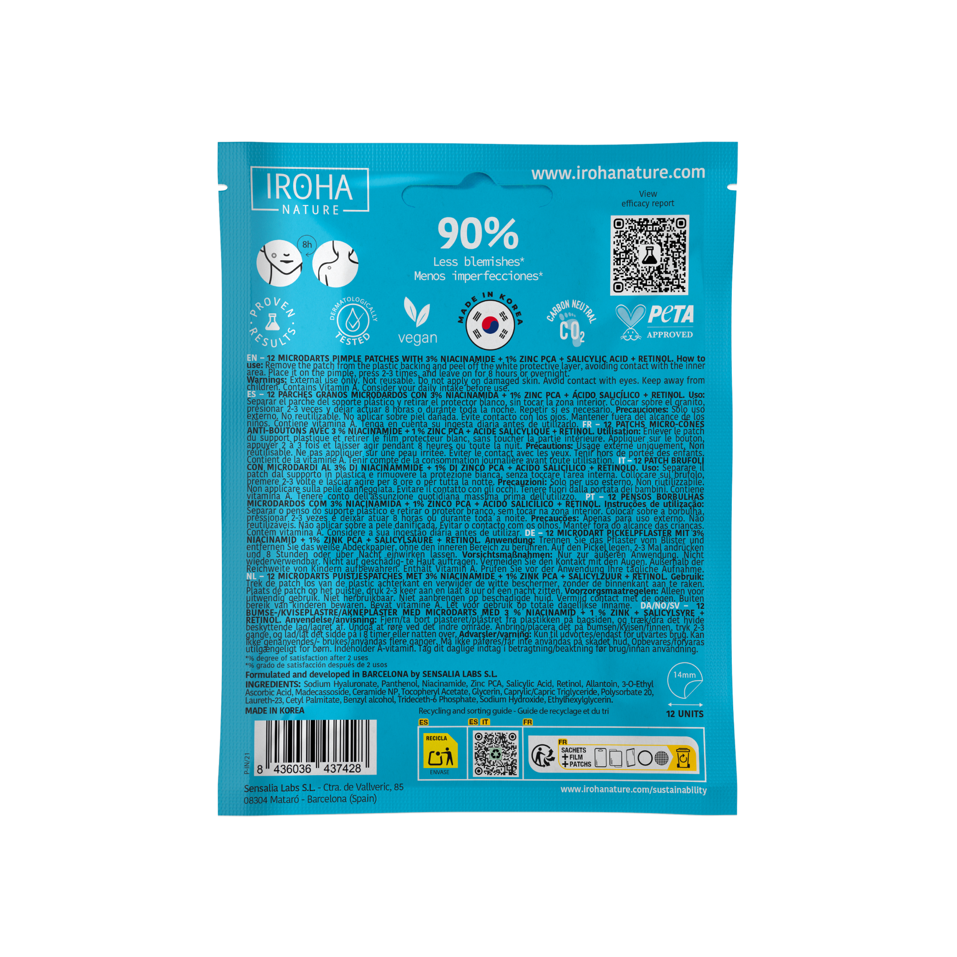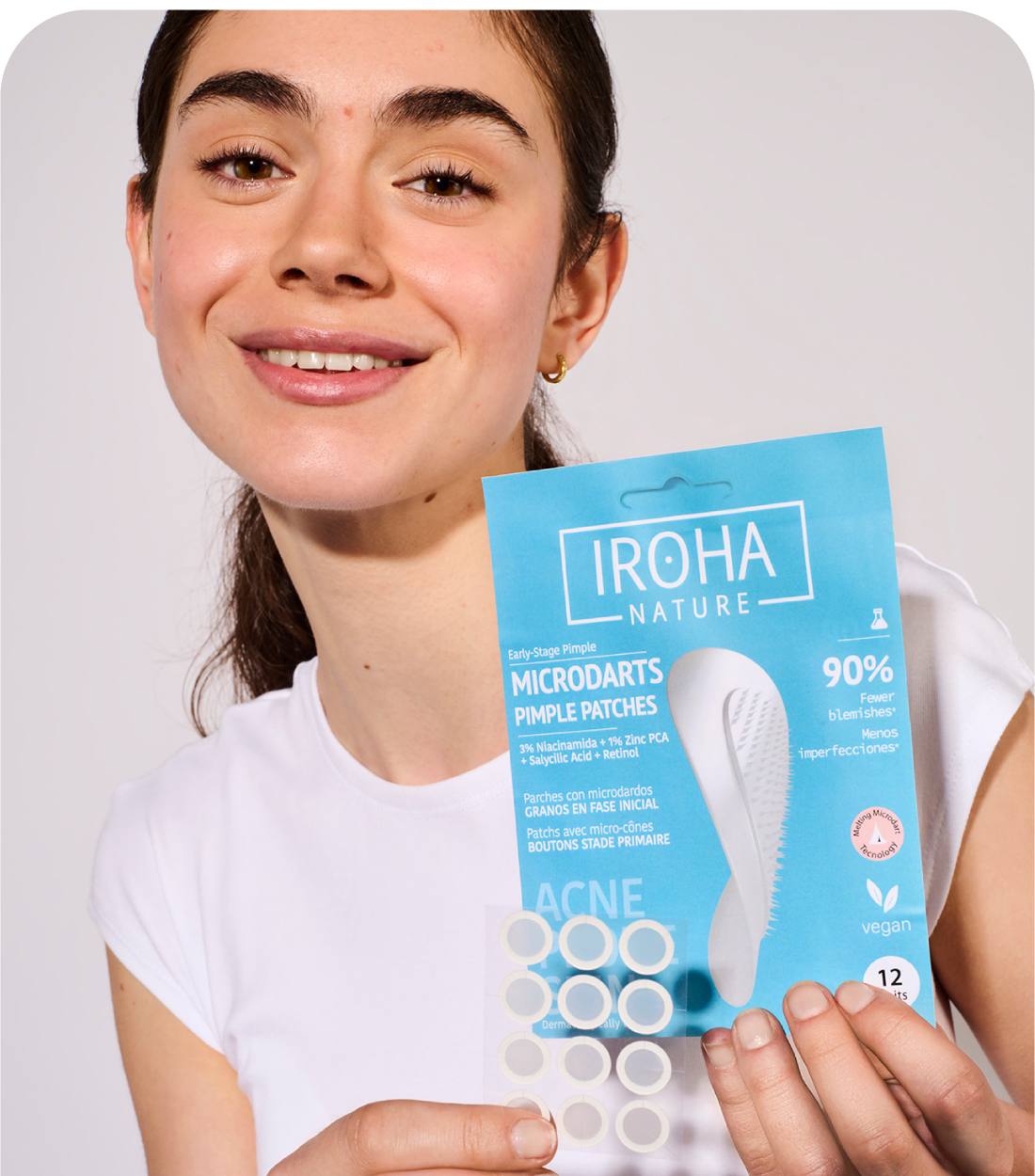 Los Parches Microdardos han sido desarrollados para actuar de forma intensiva sobre los granos localizados sin punta. Combinan una doble tecnología avanzada: una base hidrocoloide y un sistema central de 175 microdardos sólidos, que atraviesan suavemente la capa córnea y permiten una liberación transdérmica optimizada de sus 5 ingredientes activos: Niacinamida, Zinc PCA, Ácido Salicílico, Retinol y Ácido Hialurónico.