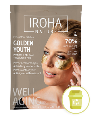 Parches Ojos Antiedad y Reafirmante ORO con tecnología foil son una solución antiedad avanzada que trata de forma intensiva el contorno de los ojos para revitalizar la mirada con un efecto luminoso y rejuvenecedor. Reafirman, mejoran la elasticidad y previenen la aparición de arrugas y líneas de expresión. Los parches de ojos antiedad de Iroha nature contiene activos altamente eficaces, como el Oro 24K que aporta luminosidad y mejora la firmeza de la piel, Péptidos que estimulan la síntesis de colágeno, ayudando a reducir arrugas y líneas de expresión y Ácido Hialurónico que hidrata en profundidad, para conseguir resultados visibles desde la primera aplicación.