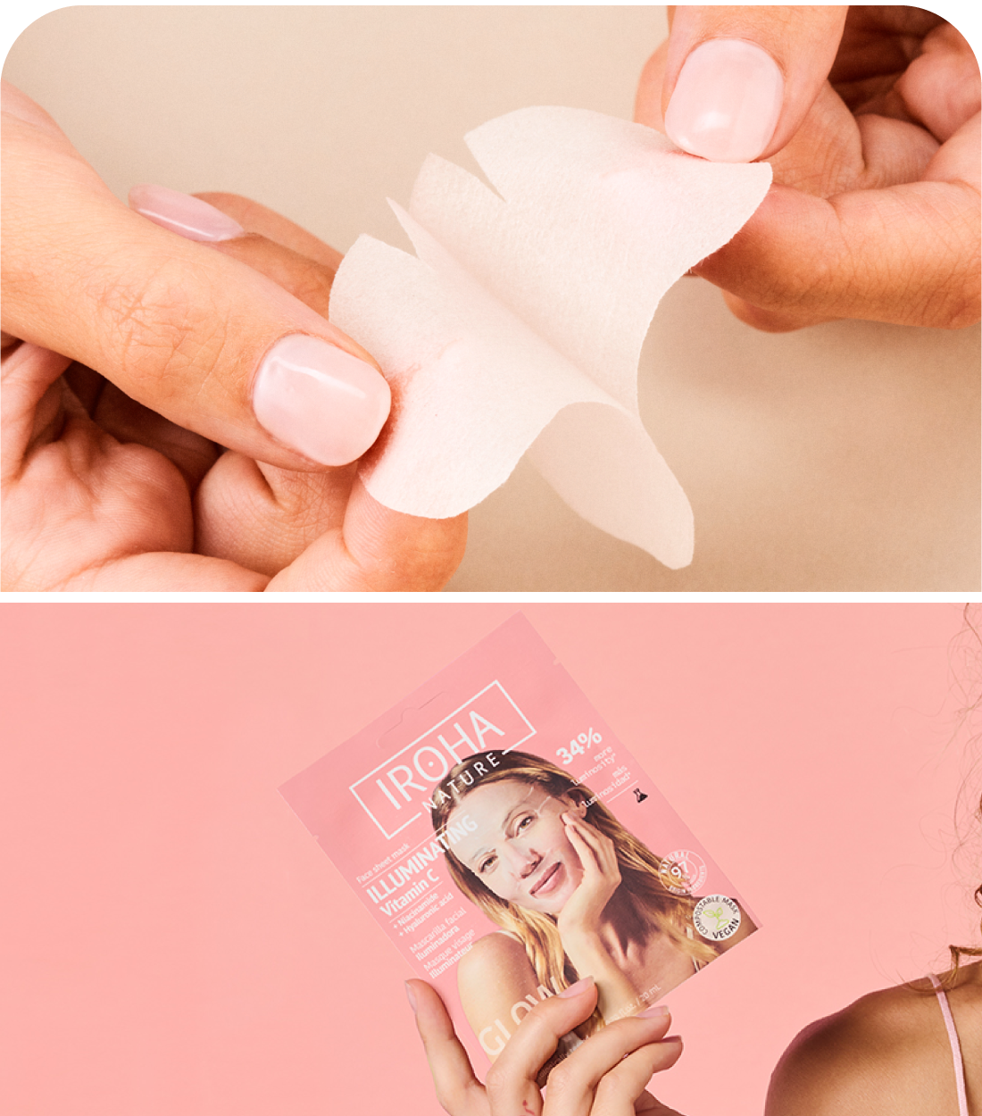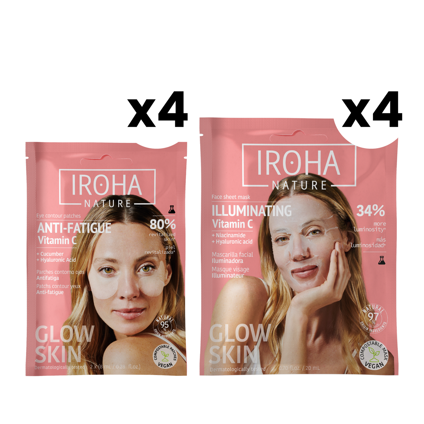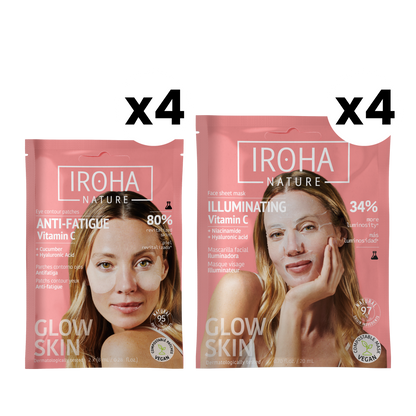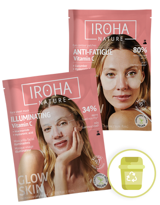 Dale a tu piel un boost de luminosidad con la Rutina iluminadora con Vitamina C de Iroha Nature. Esta combinación de 4 Mascarillas Tisú Iluminadoras con Vitamina C y 4 Parches Ojos Antifatiga con Vitamina C está diseñada para revitalizar, hidratar y mejorar el tono del rostro y la mirada en solo unos minutos.