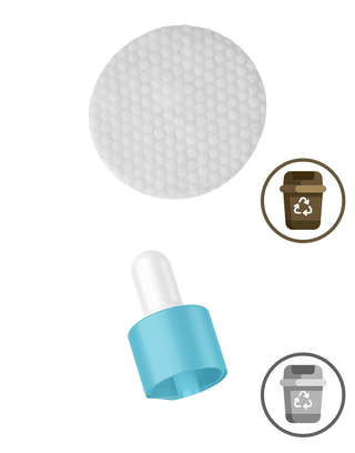 Prevent & Correct Serum: The outer packaging goes into the yellow container. The bottle and pipette go into the green container. The nitrile teat goes into the grey container.