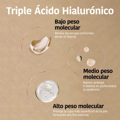 LOW MOLECULAR WEIGHT HYALURONIC ACID: allows attenuating deep wrinkles from the inside, resulting in a more youthful skin.