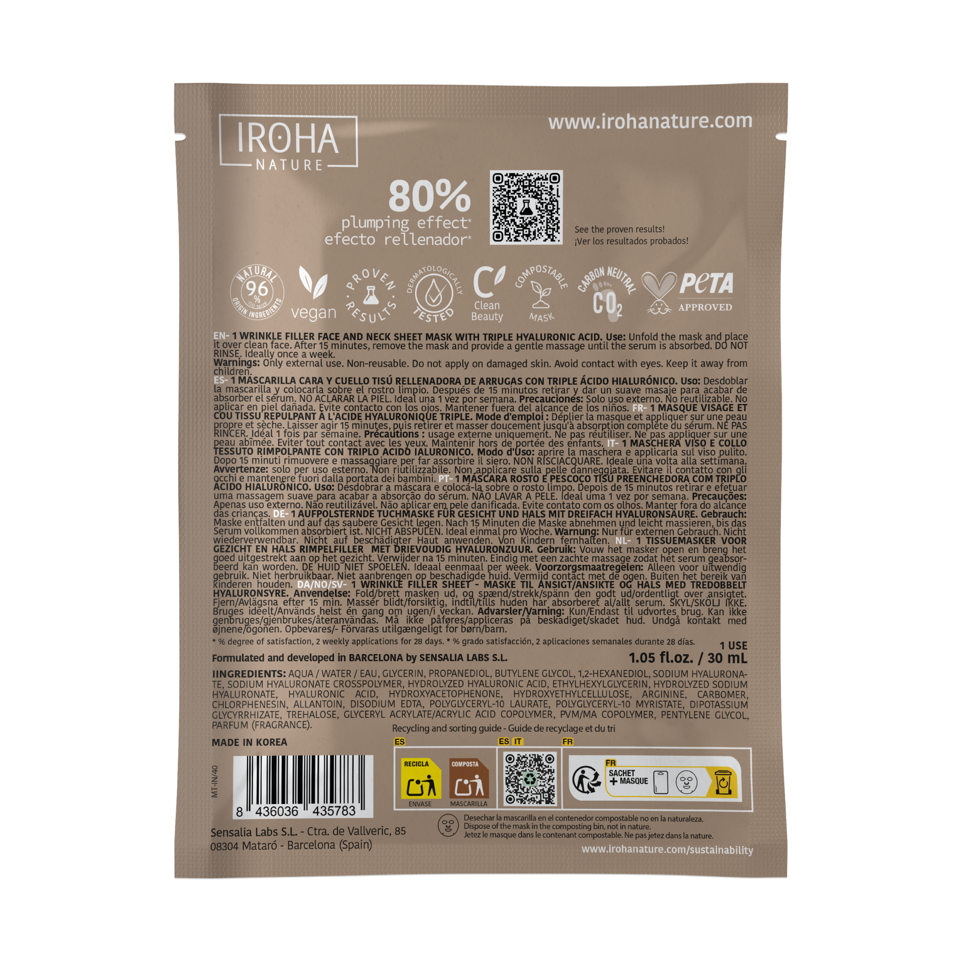 Our masks present a tissue fabric that is 100% biodegradable and are made of cotton and eucalyptus from sustainable forests. This biodegradable fabric offers an excellent system for optimal penetration of actives and best results, while respecting the environment, as they degrade in the soil in only 75 days without leaving a trace in the ecosystem if recycled in the organic container.