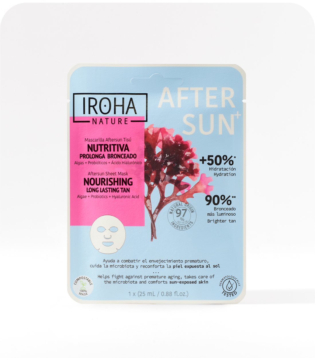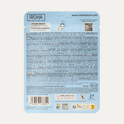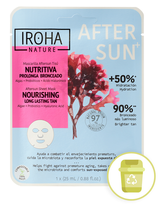Mascarilla facial aftersun nutritiva la solución ideal para nutrir en profundidad tu piel después de la exposición al sol, para prevenir la sequedad y deshidratación, potenciar un tono bronceado durante más tiempo, combatir los signos de envejecimiento prematuro como arrugas y líneas de expresión y fortalecer la barrera protectora de la piel para conseguir una piel más resistente, más fortalecida y más protegida gracias a su fórmula con Algas, Probióticos, Inositol y Ácido Hialurónico.