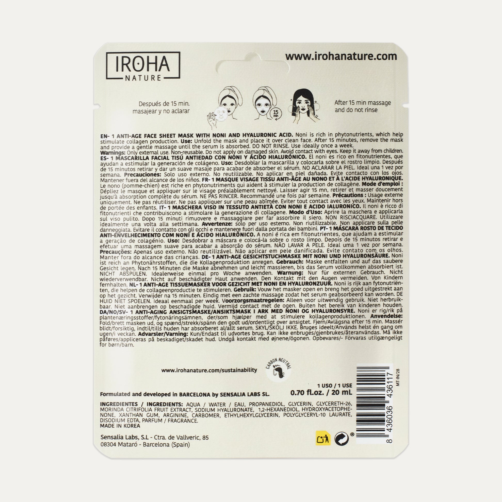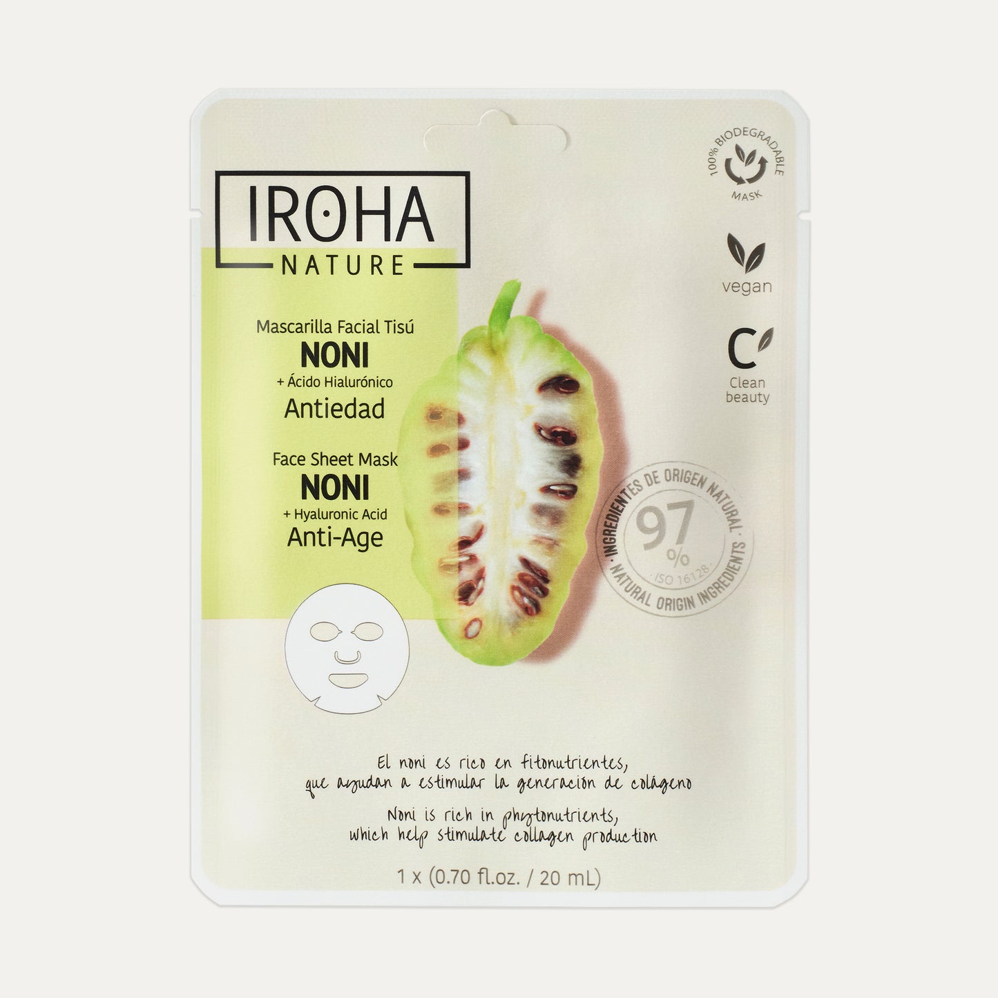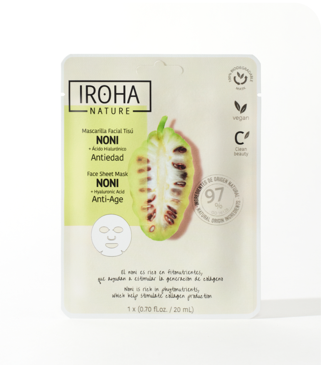 Mascarilla facial antiedad enriquecida con Noni que promueve la síntesis de colágeno mejorando la firmeza y la elasticidad de la piel. Perfecta aliada antiedad que combate los primeros signos de envejecimiento suavizando y atenuando las arrugas y líneas de expresión finas. ​ Además, esta mascarilla tisú contiene ácido hialurónico se encarga de aportar una hidratación y suavidad instantánea.