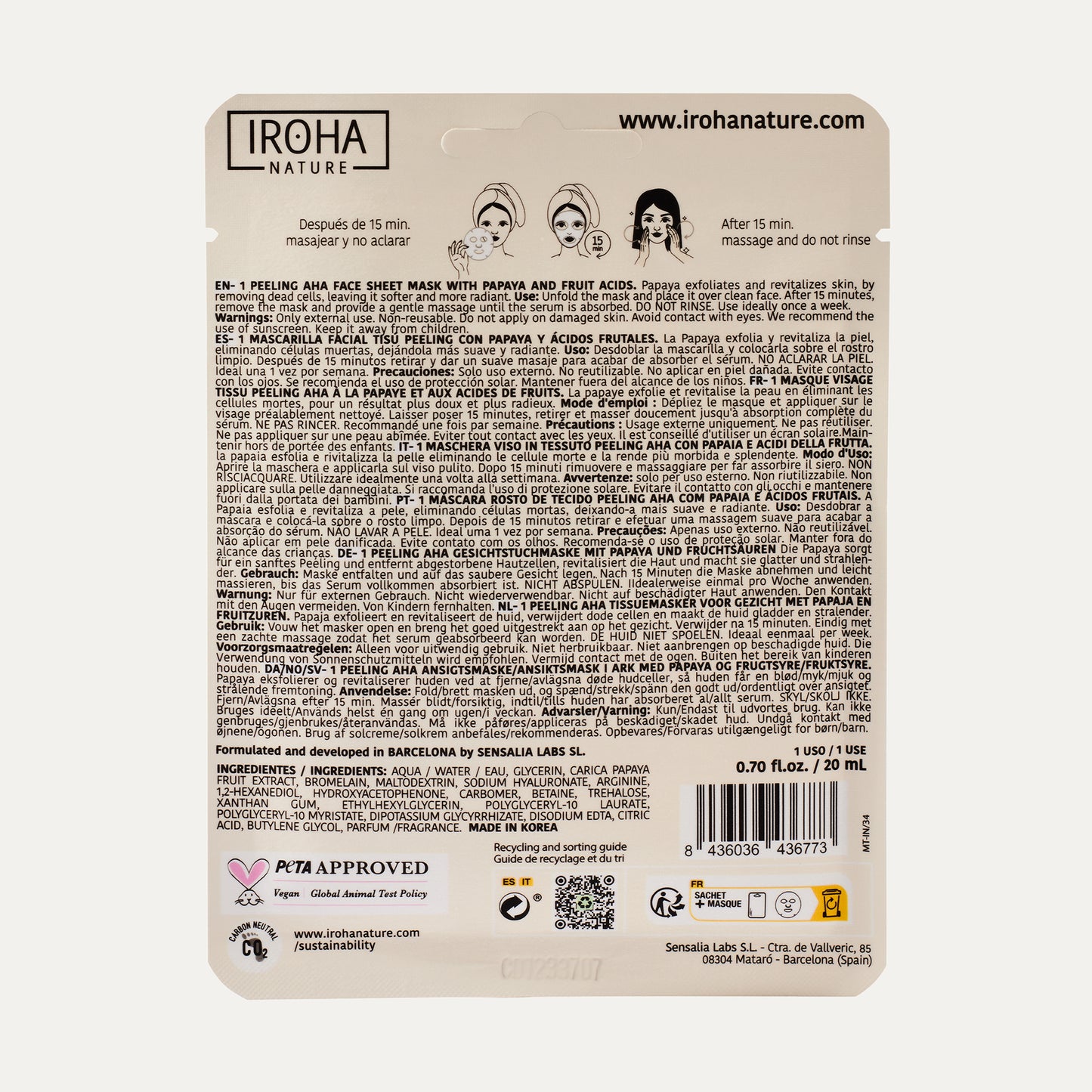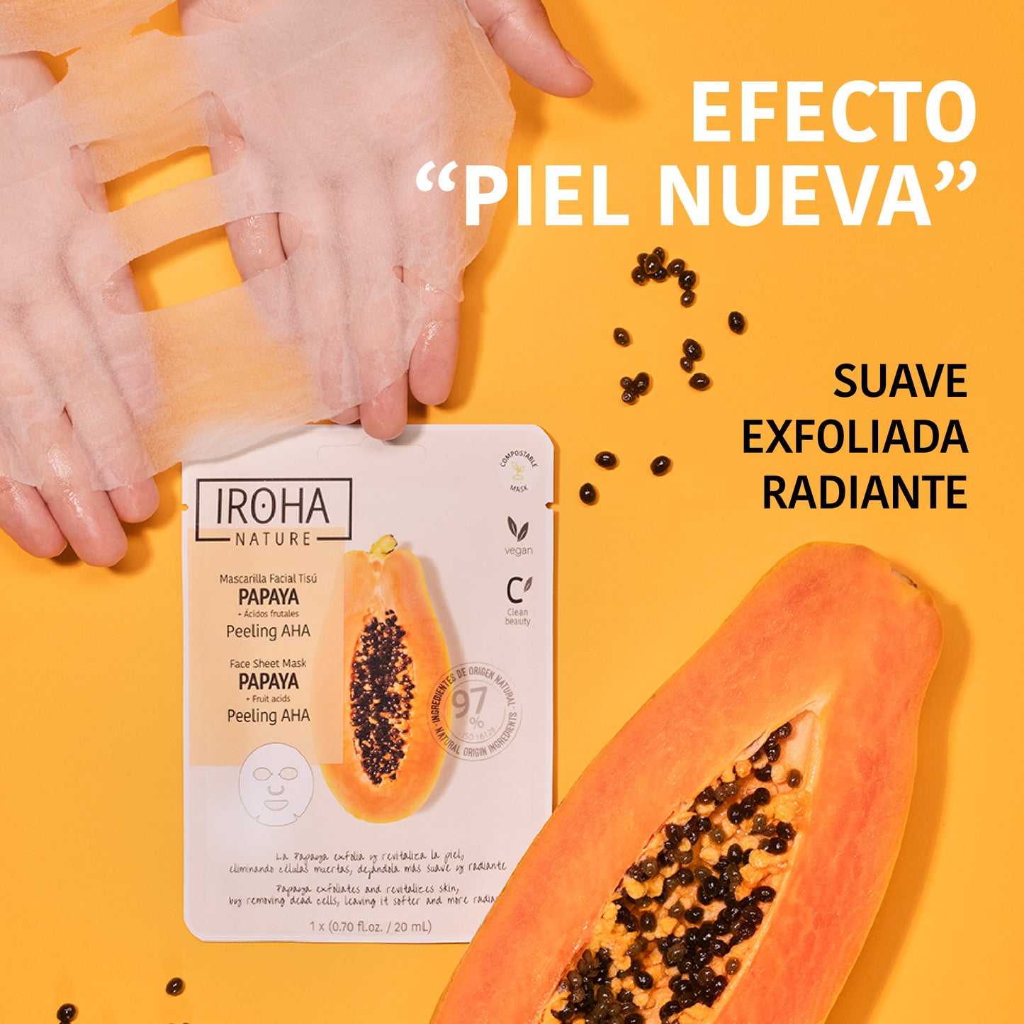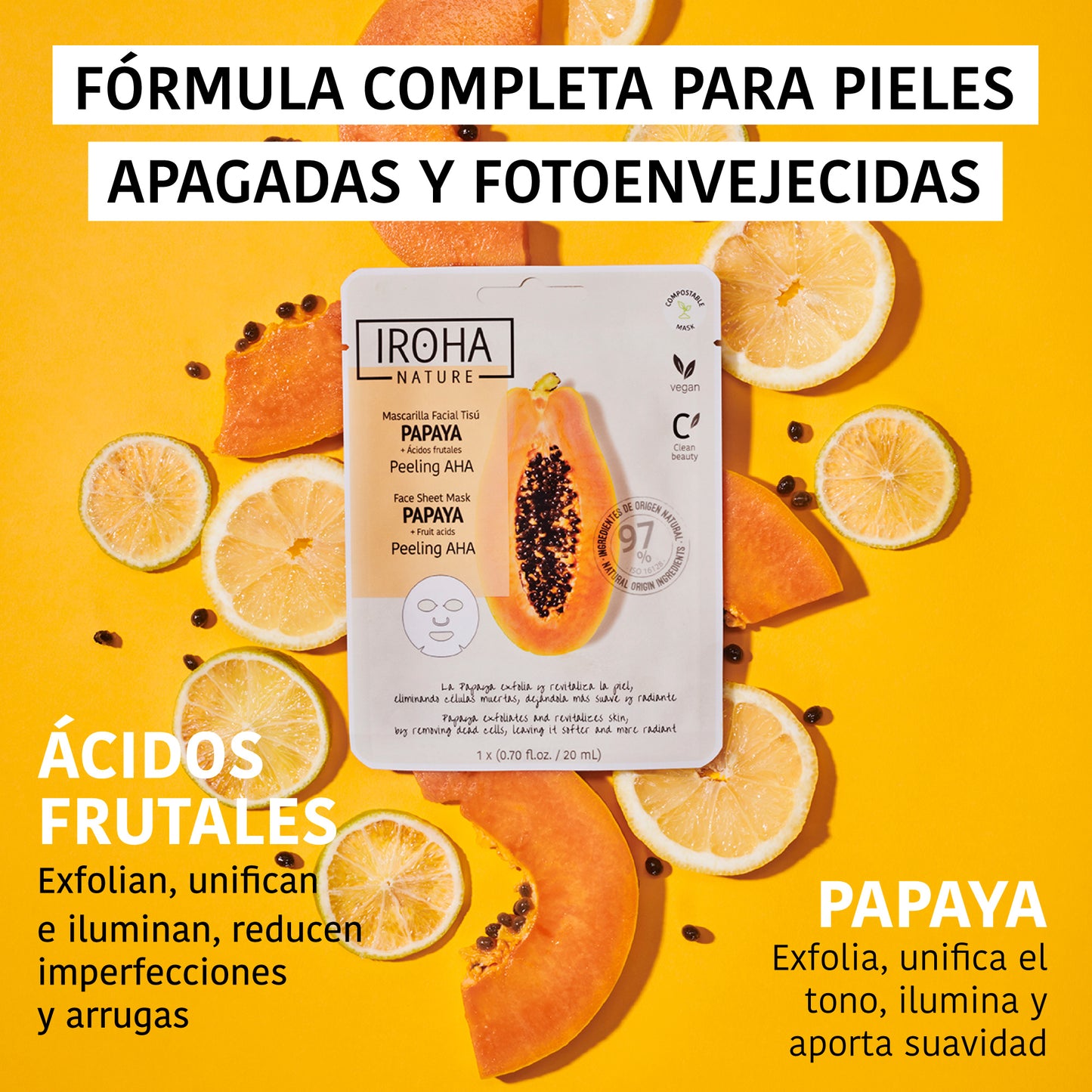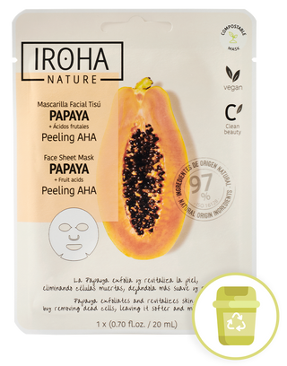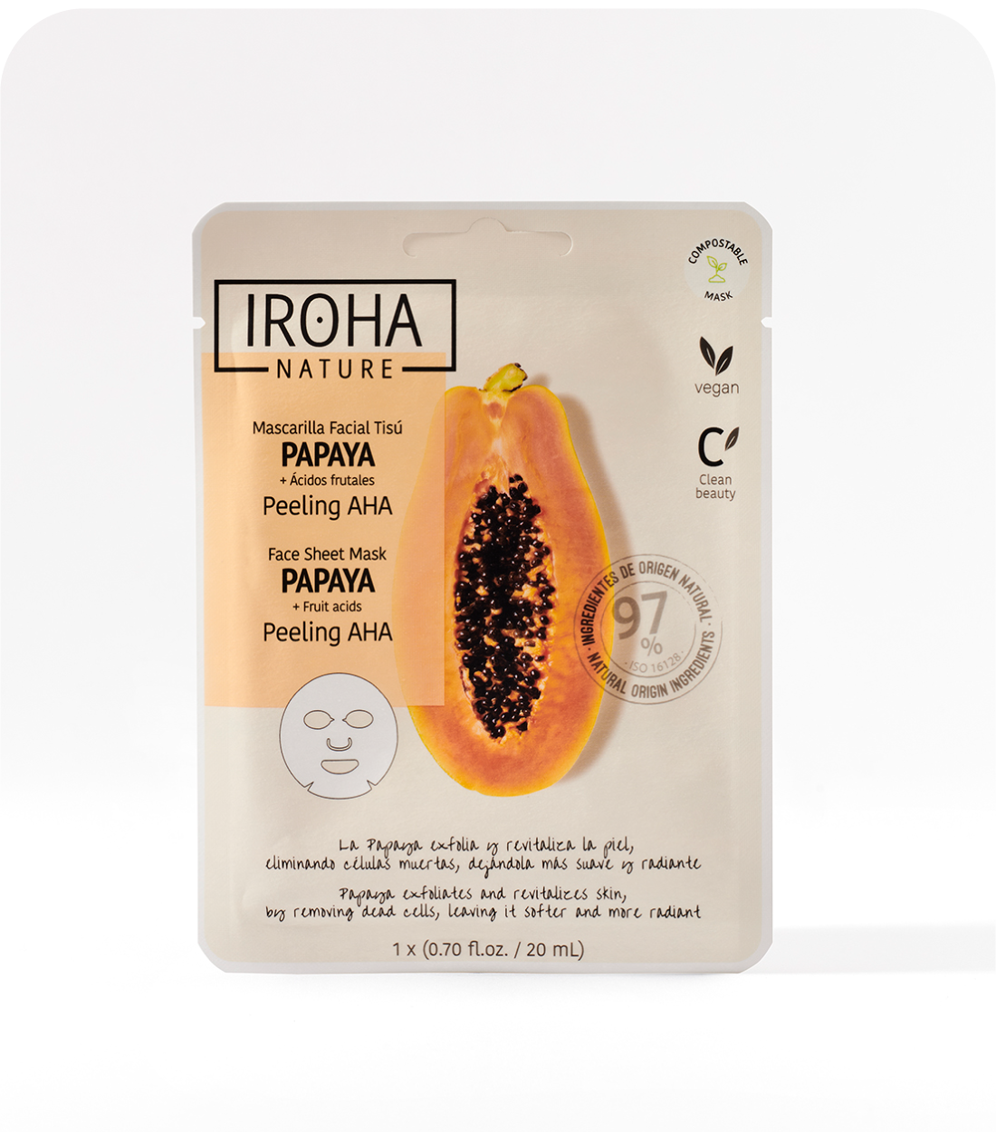 Iroha mascarilla facial exfoliante enriquecida con Papaya que promueve la renovación a partir de realizar una exfoliación muy suave, eliminando las células muertas, minimizando los poros, aportándole luminosidad y un aspecto más revitalizado. Además, esta mascarilla tisú contiene Ácidos Frutales (AHAs) conocidos por su acción peeling en la capa superior de la piel donde se encuentran las células dañadas que son las responsables de darle un aspecto uniforme y desigual a la piel, dejando así una piel más suave y luminosa.